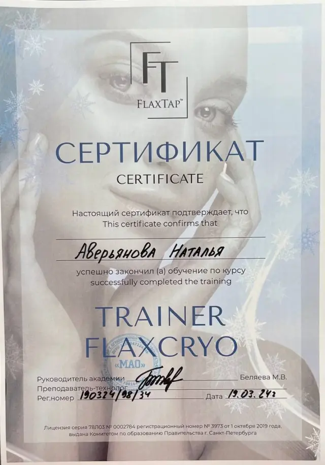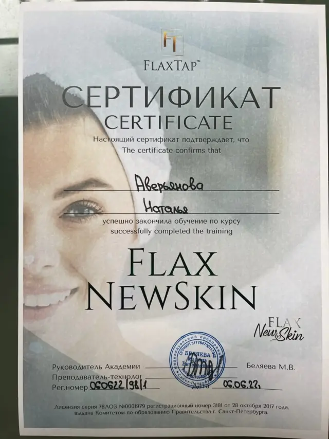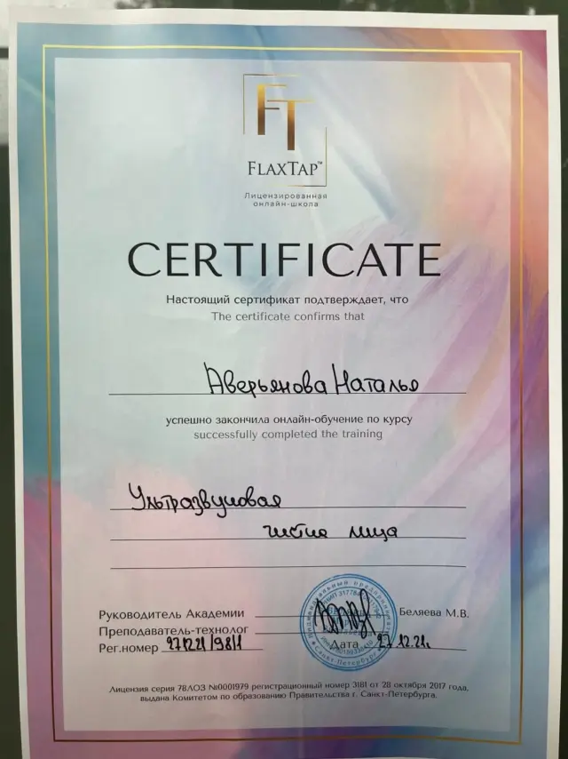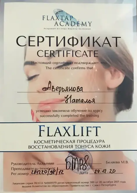 Лицензированный тренер академии по безынъекционному омоложению лица FlaxTap Academy
